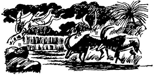 Мальчик, взвалив антилопу на плечи, направился в деревню, а я и двое рабочих стали подниматься вверх по реке. Ее долина внезапно сузилась до двух-трех метров, а дальше простирался глубокий плес. Обходя его, мы карабкались по крутому, местами отвесному и скользкому склону, цепляясь за траву, кустарники и тонкие деревья. Опустившись снова на дно долины, попали в папоротниковый лес. Почудилось на какое-то мгновение, что добрый волшебник отбросил меня на тысячелетия назад, в те далекие времена, когда по лесам бродили гигантские безрогие носороги (индрикотерии) и другие давным-давно вымершие животные. Древовидные папоротники, которыми я любовался, достигали высоты пяти метров. В европейской части нашей страны они вымерли 30 миллионов лет назад, а в Африке существуют и по сей день. Климат в этих приэкваториальных районах, видимо, мало менялся, иначе не выжить бы древовидным папоротникам.