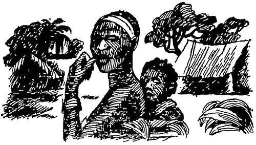 После полудня, когда с устройством в хижине было покончено, решил взглянуть на окрестности. Шагаю по дороге вдоль реки. Вскоре меня догоняет рабочий Жан-Пьер Гимби, помогавший мне по устройству хижины. Он решил меня сопровождать. Около одного из деревьев Жан-Пьер остановился, сорвал несколько листьев и протянул мне. Листья как листья. Правда, показались жесткими и имели необычно шероховатую поверхность. «Эти листья, – заметил Жан-Пьер, – употребляются при изготовлении мебели, они царапают как настоящий наждак». Итак, «наждак» в Конго растет на деревьях. Около одной из хижин маленькой деревушки увидели, как женщина разбирала гроздь орехов масличной пальмы. Жан-Пьер рассказал, что стержни от гроздей орехов не выбрасываются, из них изготовляют палочки для игры на тамтаме. У народностей басунди и лари бытует поверье, что только такими палочками надо играть на барабане при отпевании покойника. Тогда остальные члены семьи будут долго жить. Если же пользоваться палочками из другого дерева при отпевании, в семье через один-два месяца будет новый покойник.