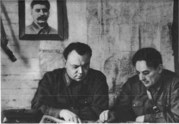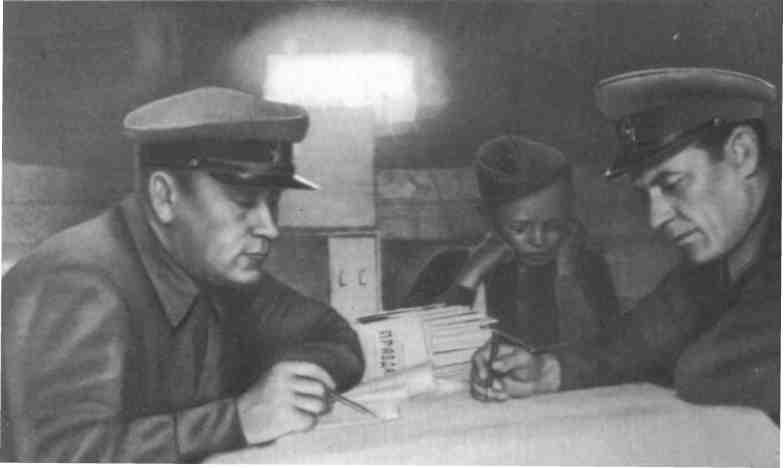 1942 год. И. А. Бельский и В. И. Козлов в партизанской землянке за разработкой плана боевой операции.