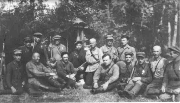 Партизаны и представители Пинского обкома КП(б)Б в штабе Минского соединения. В центре, рядом с мальчиком, сидит В. И. Козлов.