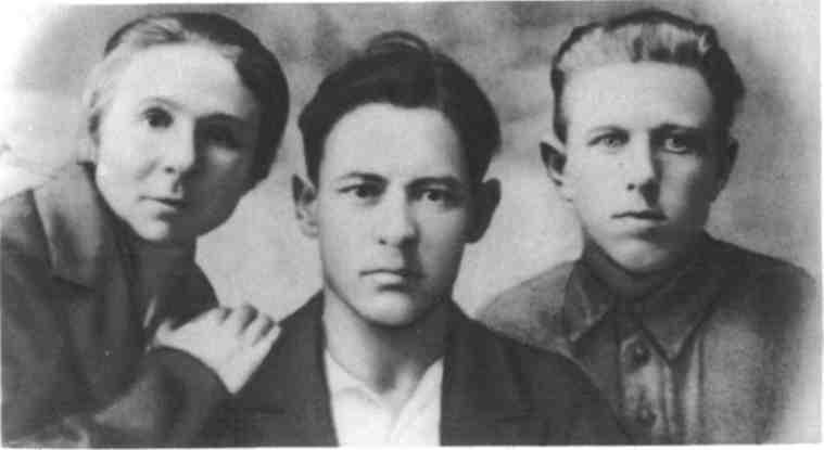 1936 год. Е. Е. Козлова, В. И. Козлов и И. Прокопович, секретарь комсомольской организации Старобинской МТС.