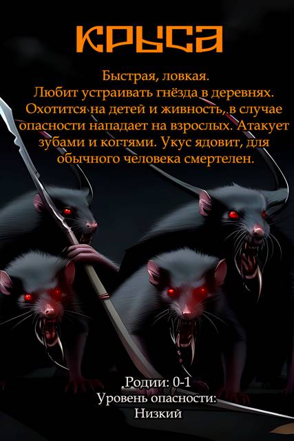 Ну… Похоже на крысу, да. Только, судя по описанию, крысу-переростка. Размером значилось «поболе кошки, поменьше собаки». О многообразии пород тех и других, всяких там мейнкунах и йоркширских терьерах местные ребята узнают ещё не скоро. Эх-х, благословенные времена!