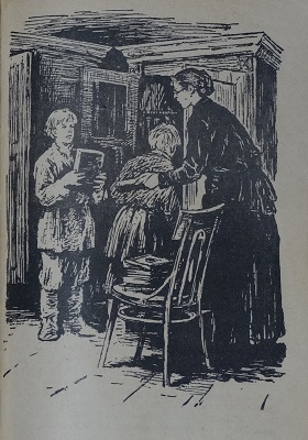 Забравшись на лавку, Ваня вынимал книжки из шкафа.