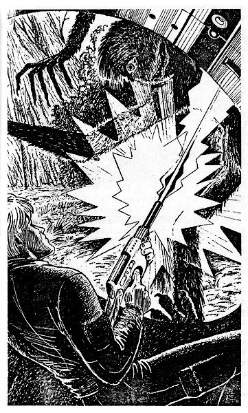 Неожиданная перемена вдруг произошла с «Валентином». Черты его внезапно исказились, начали оплывать, правый глаз вдруг въехал в переносицу, а левый исчез где-то за ухом, нос провалился. Долю секунды на нас смотрела кошмарная одноглазая морда, покрытая дымчатой шерстью. Чудовище пронзительно каркнуло и отпрыгнуло назад.