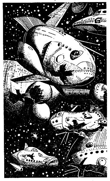 Зрелище настолько же неестественное, как и уродливое. Паноптикум. Кладбище подбитых звездолетов. Именно подбитых. Внутренности их разворочены крестообразными пробоинами, совершенно одинаковыми, как печать, тавро. Они проплывают мимо тормозящего «Феникса», не выказывая ни малейших признаков жизни. Мертвые. В прожекторном свете видны палубные надстройки, некоторые почти неповрежденные, совершенно фантастических очертаний. От них тянутся длинные тени, закрывая другие корабли. Ничего общего с земными звездоскафами. На земные корабли они похожи так же, как муха на ящерицу. Сколько же они здесь лет? Сто? Тысячу? Миллион? По Земле, возможно, еще бродили динозавры, когда первый из них потерпел здесь крушение.