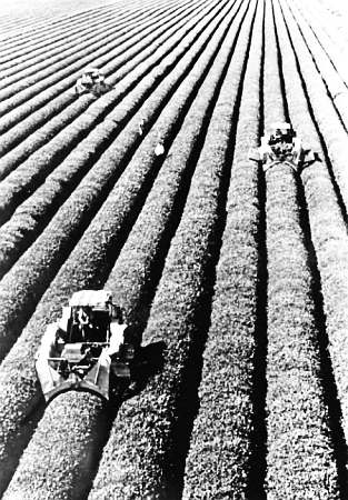 И все-таки машина была придумана. Слово «чудо» довольно замызгано неумеренным употреблением, но именно этим словом надо назвать механизм, соединивший в себе глаза и чуткие руки сборщика. Машину придумали в Грузии. Из Аргентины, из Бразилии, Турции и Японии сразу же приехали специалисты поглядеть на машину и, поглядев, повели разговор о покупке – «машина – это целая революция в чаеводстве». На фотографии хорошо видно, как идет стрижка чайных «борозд» этой машиной. Не следует забывать только, что машина не просто стрижет кусты, машина выбирает только самые нежные, молодые листы. Только они дают янтарному отвару неповторимые запах и вкус.