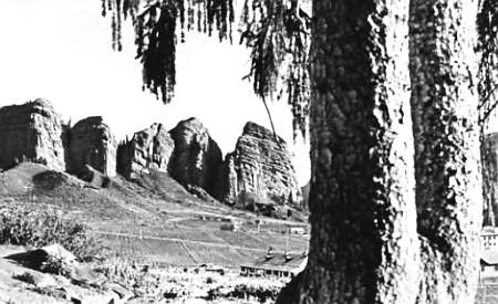 Путник, если он шел из ущелья, обязательно остановится. Если в ущелье – тоже остановится. Небо синее, верхушки гор сиреневые, вся долина синяя и зеленая. И только эти семь скал ярко-красные. На закате и на восходе солнца, когда низина заполнена сумраком, освещенные скалы похожи на языки красного пламени.