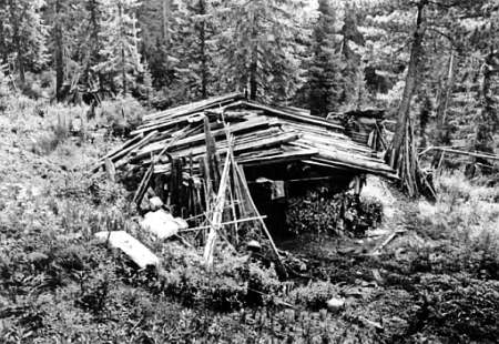 Час ходьбы по тропе, уже известной нам по рассказам геологов, и вот она, цель путешествия – избушка, по оконце вросшая в землю, черная от времени и дождей, обставленная со всех сторон жердями, по самую крышу заваленная каким-то хозяйственным хламом, коробами и туесами из бересты, дровами, долблеными кадками и корытами и еще чем-то, не сразу понятным свежему глазу. В жилом мире эту постройку под большим кедром принял бы за баню. Но это было жилье, простоявшее тут в одиночестве более сорока лет.