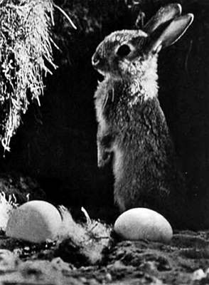 Этот снимок, сделанный немцем Георгом Кваденсом, нуждается в пояснении. Фотограф караулил момент, когда законный хозяин выглянет из норы. Но неожиданно из подземелья полетели пух, перья, и одно за другим, как камни, стали выкатываться яйца. «С видом победителя на свет божий появился кролик», – сообщает фотограф.