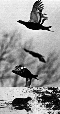 С первого дня – в гущу жизни! – таков закон выводковых птиц. Иным из них приходится преодолевать еще барьер высоты. Некоторые утки выводят потомство в дуплах деревьев или в дуплянках, повешенных человеком. Обсохнув, птенцы один за другим бесстрашно с большой высоты устремляются вниз. Парашютом им служат пух и перепонки на лапах. Если «десант» задерживается, мать-утка (смотрите снимок) побуждает их быть посмелее. Сама она, будучи птенцом, уже совершала такой полет. Иногда гнездо оказывается далеко от воды, и утка отважно ведет к ней «десант» два-три километра, обходя опасности и препятствия.