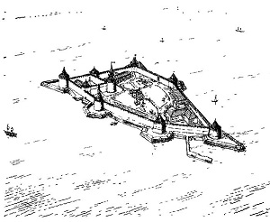 Общий вид крепости Орешек. Рисунок В. М. Савкова к проекту восстановления.