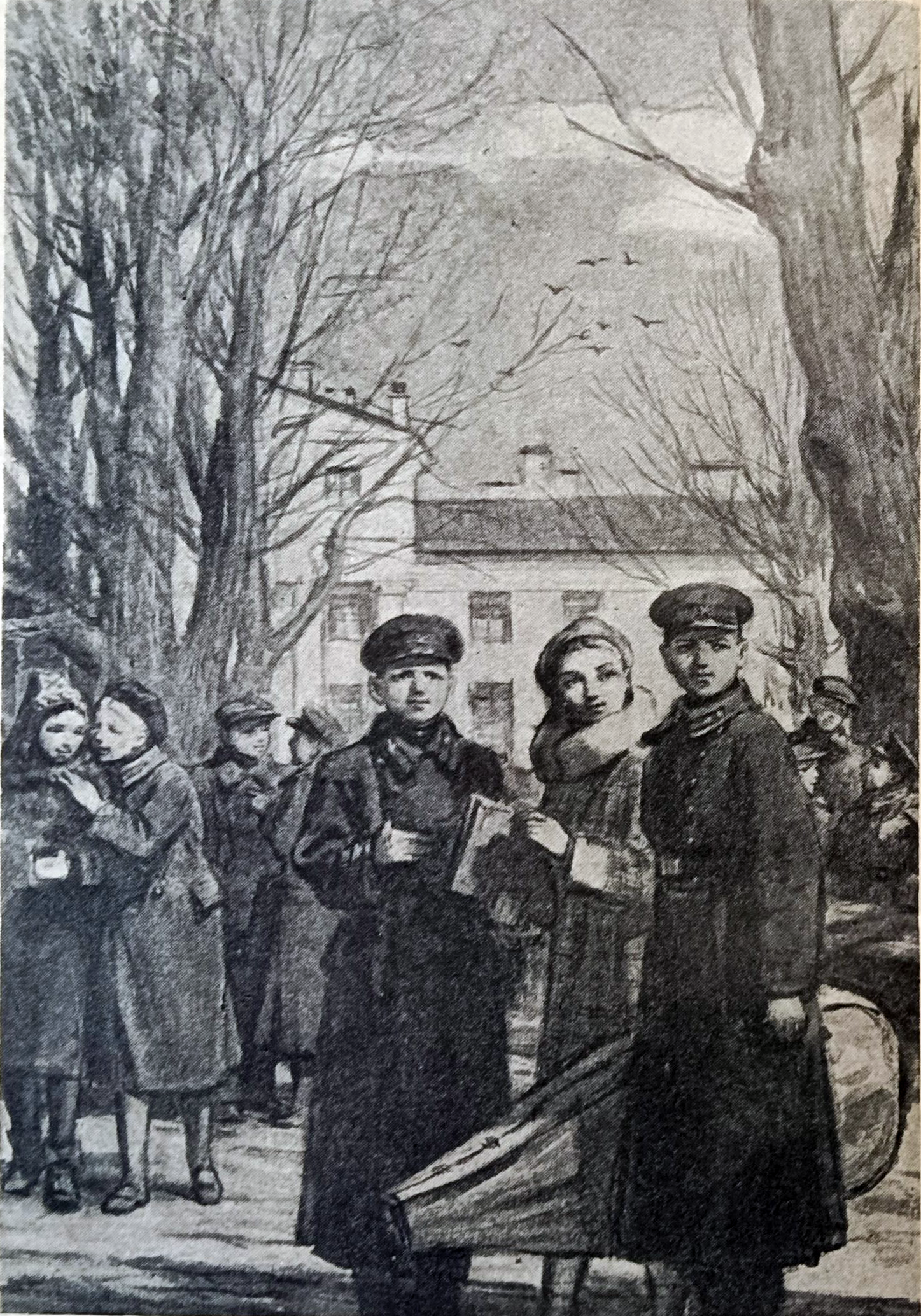 Иван Спиридонович до войны работал с лучшими художниками Дома моделей. В училище он поступил на временную работу, да так здесь и остался. Частенько он грозил уйти и не смог покинуть хлопотное, беспокойное место, видя, сколько радостей ребятам доставляет форма. Так и сейчас: разве мог он обидеть младшего Ростова? Троих он одел, а четвертого оставил без обмундирования? Подгонка рукавов заняла у него полчаса. Антонина Осиповна сходила в кладовую, принесла ботинки и носки. В мастерскую подростки входили, одетые так: Вадим в военной форме, Антон в засаленном пиджаке, галифе и стоптанных рыжих бурках, на голове пыжиковая шапка с длинными ушами, Георгий в обветшалом макинтоше, Анатолий в полушубке и валенках, а вышли в одинаковой форме. На весь двор раздавался скрип их неразношенных ботинок, а на петлицах необмятых шинелей серебром отливали буквы и цифры: «РУ 112».
