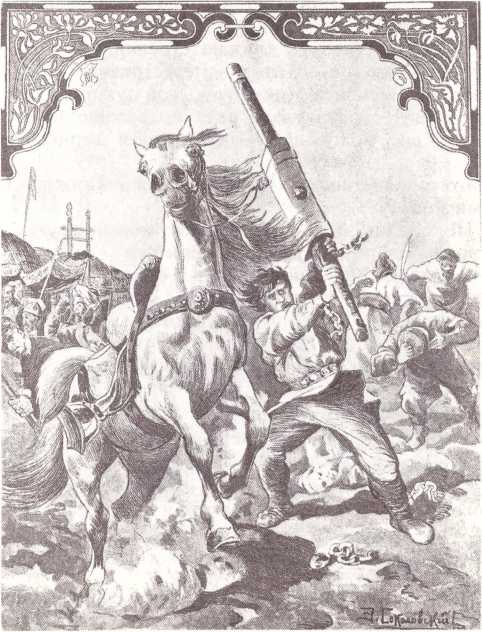 Разгорелось у Сухмана богатырское сердце, и надумал он переведаться с татарской силой. Направил Сухман своего коня через реку на крутой берег; взвился конь, как птица, – вмиг очутился на другом берегу; видит Сухман – стоит на дороге дуб вековой крепкий; выдернул он тот дуб из земли вместе с корнями, взял с собой, промолвил:
