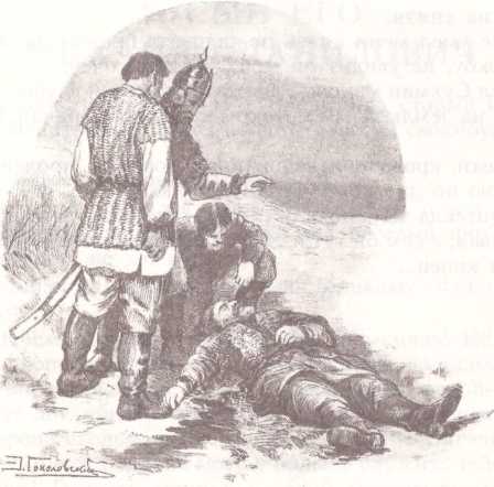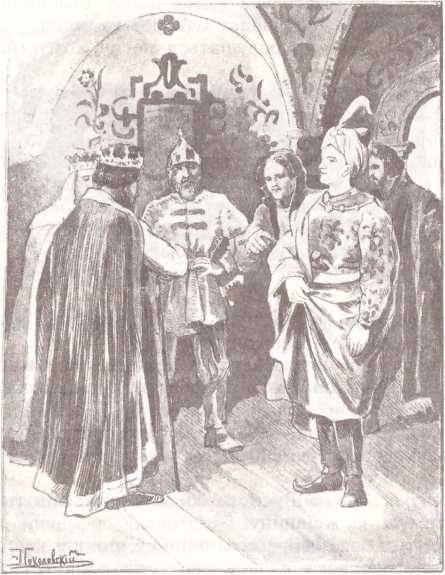 – Что-то мне невесело, ласковый князь; уж не случилось ли у нас дома что-нибудь недоброе? Мать здорова ли? Да и гусляры твои, князь, все поют нерадостные песни. Нет ли у тебя певцов получше? Слыхал я дома, что есть у тебя славный певец, Ставр Годинович; он из нашей земли, поет наши песни; прикажи его выпустить из темницы, пусть споет нам на пиру.