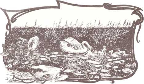 Вскочил Михайло, вышел из шатра; никакой красной девицы не видит, только лебеди плавают по заливам; среди них плывет величаво черная лебедь в золотых перьях, голова у ней унизана скатным жемчугом и камнями самоцветными.