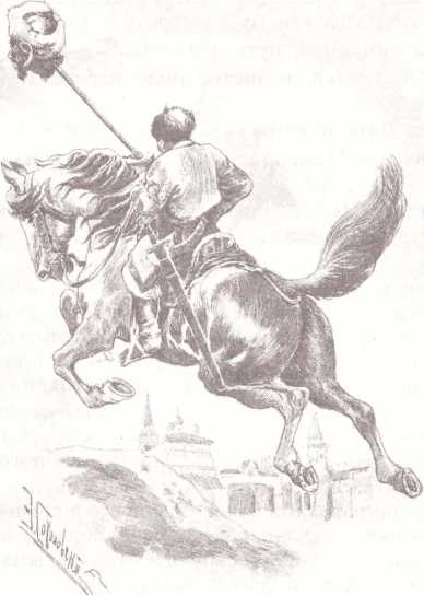 Распрощались тут отец с сыном; направился Михайло к Киеву; въезжает в город не воротами – через высокие стены на коне перескакивает, через башню по воздуху перелетает.