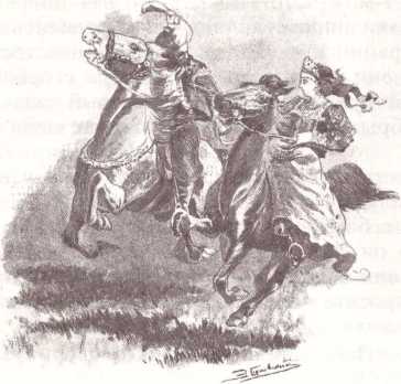 Побежал конь что было силы, реки, озера перепрыгивал, темные леса между ног пропускал.