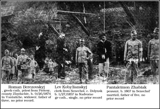 Читателю нужно помнить, что приведенное ниже число жертв – это лишь капля в море общенародного мученичества, слез и крови Галицкой Руси. Стоглавая гидра набросилась на свою беззащитную добычу. В отчаянном страхе метался галицко-русский народ из стороны в сторону и не знал куда бежать. Немцы и мадьяры бесились, как гады, и причину своих отступлений и поражений старались оправдать неблагонадежным поведением и изменой галицко-русского населения. В манифестах и воззваниях военные и административные власти обещали от 50 до 500 крон каждому, кто донесет на русина. На улицах и площадях галицких городов платные агенты выкрикивали: «ловить шпионов! Давайте их сюда на виселицы!» Партийные вожаки, ослепленные местью, на этот ядовитый клич приходили с добровольной помощью.