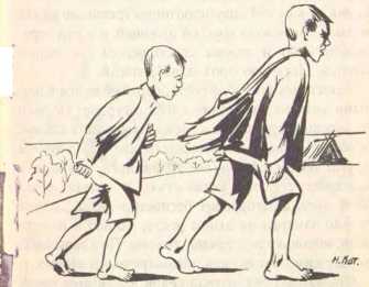 Шли, широко шагая по шпалам, схватившись рука с рукой. Ванька пригнулся, увеличивая шаг, старался итти в ногу, устало сопел. Глядели под ноги, точно боялись, что если взглянут в сторону, то увидят еще более страшное, чем не выходивший из головы мужик с прорубленной головой. Ванька шопотом пожалился: «Поесть бы». Степка кое-как утешил его, отвлекая от еды.