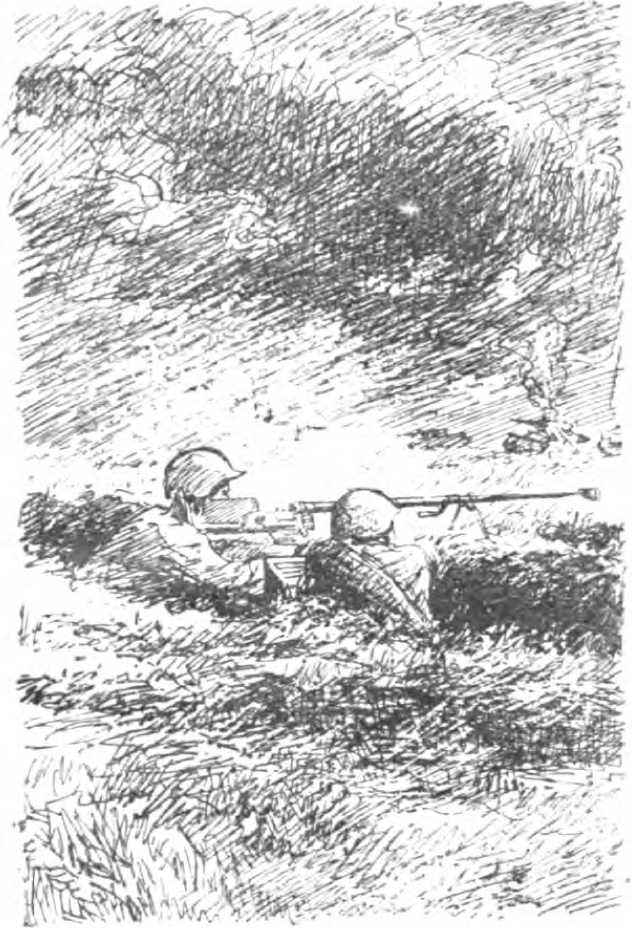 Почти до рассвета не спал Громов, лежа на дне «пистолетной» щели, устроенной таким образом, что в нее можно было упрятаться и расчету и противотанковому ружью на тот случай, если германским танкистам удалось бы утюжить гусеницами наш передний край. Валькин дремал, прислонившись к стене ямы. Ему было холодно, и он то и дело натягивал на ляжки полы шинели. Громов сидел рядом с ним и постукивал зубами. «Керосинка» повесила ракету прямо над их головами, и в щели стало так неприятно светло, что Валькин проснулся. Он посмотрел на Громова и тихо, позевывая, сказал: