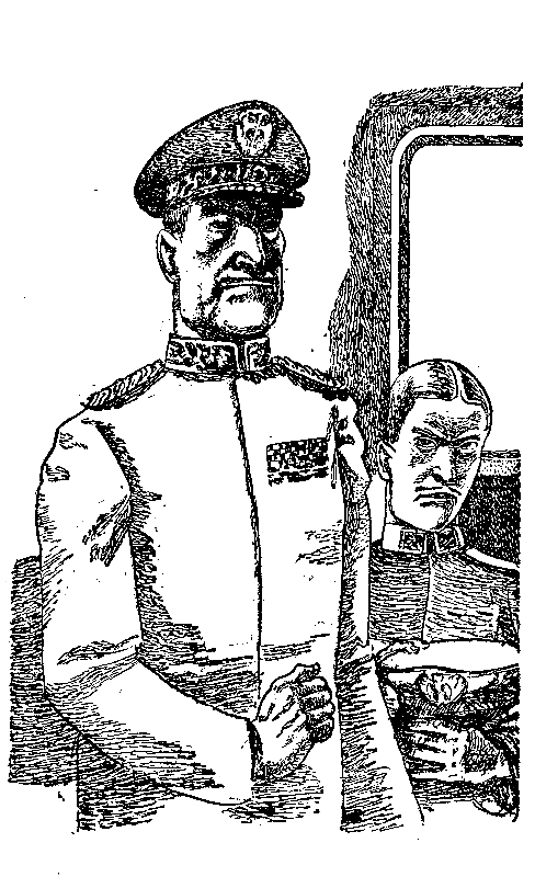 Человек, сидевший в кресле, медленно поднимал голову. Под козырьком фуражки забелела повязка, туго стягивавшая лоб: Осунувшееся, как у тяжелобольного, лицо, тоненькие усики, острый с горбинкой нос, черные брови над глубоко запавшими глазами.