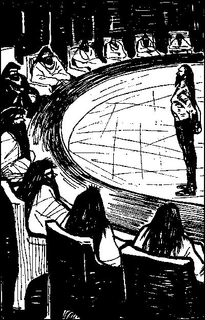 Здесь проходил, видимо, суд. Гарамуины с торчащими во все стороны жесткими черными волосами, с красными лицами, в длинных сверкающих драгоценностями одеждах, скрывавших руки и ноги, сидели полукругом, а перед ними стоял голый по пояс рамуин. Длинные волосы его были заломлены назад, связаны вместе с голыми мускулистыми руками, закинутыми за спину и схваченными в кольцо.
