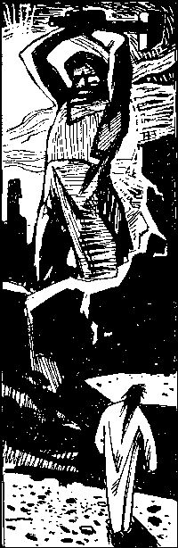 Старик поднял голову – лицо его, искаженное горечью обрушившегося несчастья, вдруг просветлело. Он смотрел в дальний угол, там что-то возвышалось, окутанное покрывалом. Скульптор тяжело встал, подошел и стащил полотно. Это была единственная уцелевшая скульптура, высеченная из камня. Пьедесталом служил расползающийся тяжелый свиток цепей, он охватывал фигуру до пояса. Это был, несомненно, простой рамуин, с сухими напряженными мускулами и широкой грудью. Лицо сосредоточенное, угрюмое; длинные волосы раскиданы ветром. Опираясь левой рукой о толстые кольца каменных цепей, он как бы привстал. В правой, высоко вознесенной руке угрожающе поднят молот. Сейчас он освободится от цепей, ударом молота раскрошит их и затем…