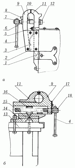 Рис. 22. Тиски: а – стуловые; б – параллельные; 1 – лапа для крепления тисков к верстаку; 2 – боковина; 3 – пружина; 4 – рычаг; 5 – планка для крепления тисков к верстаку; 6 – шайба; 7, 18 – стяжной и червячные винты; 8, 10 – козырьки; 9 – подвижная губка; 11 —неподвижная губка; 12 – втулка; 13 – верстак; 14 – нижняя плита; 15 – поворотный круг; 16 – гайка; 17 – крышка.