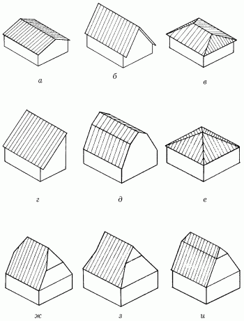 Рис. 24. Виды скатных крыш: а – пологая двускатная; б – крутая двускатная; в – вальмовая четырехскатная; г – односкатная (в форме парты); д – ломаная (мансардная) двускатная; е – шатровая четырехскатная; ж, з, и – полувальмовые (мансардные) четырехскатные.