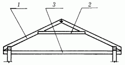 Рис. 25. Наслонные стропила: 1 – стропильная нога; 2 – ригель; 3 – чердачное перекрытие.