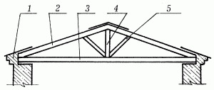 Рис. 26. Висячие стропила: 1 – мауэрлат; 2 – стропильная нога; 3 – затяжка; 4 – бабка; 5 – подкос.