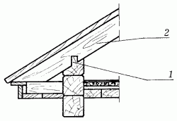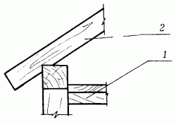 Рис. 27. Опирание наслонных стропил в деревянных рубленых или брусчатых зданиях: 1 – шип; 2 – стропильная нога.