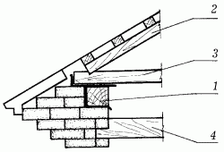 Рис. 29. Опирание наслонных стропил в каменных зданиях: 1 – мауэрлат; 2 – стропильная нога; 3 – затяжка; 4 – чердачное перекрытие.