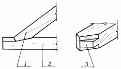 Рис. 30. Соединение стропил зубом и шипом: 1 – стропильная нога; 2 – затяжка; 3 – шип.