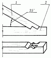 Рис. 31. Соединение стропил двойным зубом: 1 – стропильная нога; 2 – затяжка.