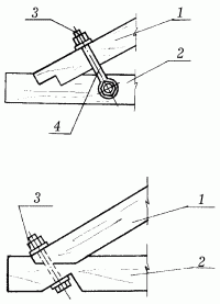 Рис. 32. Соединение стропил болтом и хомутом: 1 – стропильная нога; 2 – затяжка; 3 – болт; 4 – хомут.