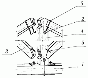 Рис. 33. Соединение подкоса с бабкой: 1 – затяжка; 2 – болт; 3 – подкос; 4 – бабка; 5 – скоба; 6 – хомут.