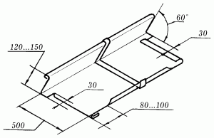 Покрытие карнизных свесов и установка настенных желобовСначала на карнизном свесе производят разметку расположения костылей: через 500–600 мм и на расстоянии 130–160 мм от края карниза. После этого берется первая картина и укладывается на костыли так, чтобы одна ее сторона плотно вошла в зазор отворота, другая же сторона гвоздями прибивается к обрешетке. Слева от первой внахлестку укладывается вторая картина – и так далее до образования первой горизонтальной ленты. По фронтонному свесу первый ряд картин кладут с напуском 25–30 мм за обрешетку, по карнизному свесу делают напуск 100 мм.