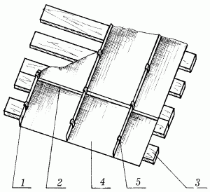 Рис. 36. Кровля из стальных оцинкованных листов: 1 – стоячий фальц; 2 – лежачий фальц; 3 – обрешетка; 4 – полотно картины; 5 – клямеры.