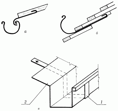 Рис. 39. Виды желобов: а – висячий желоб; б – лежачий желоб; в – висячий коробчатый желоб; 1 – скоба; 2 – желоб.