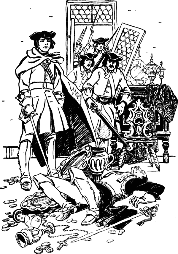 Елизар проворно отшатнулся и ткнул шпагой вперед. Клинок мягко вошел между кирасой и кожаным ремнем, пронзил тело и воткнулся в дерево. Кирасир беспомощно взмахнул палашом, выронил его и бессильно обмяк. Елизар вытащил шпагу. Хоть и приучили рубиться, а все же стало муторно; не так-то просто заколоть человека. Кирасир скребанул грязными ногтями по столешнице и рухнул.