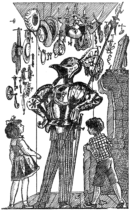 Маленьким Штенгелям было очень любопытно посмотреть, как выглядит дом Визенклее. Наверное, там найдётся немало интересных вещей. И в самом деле, таинственное началось уже в прихожей. Они увидели большой манекен, до пояса одетый в рыцарские доспехи. Эти доспехи могли бы на кого угодно нагнать страху, если бы рыцарь не был так смешон. Поверх его шлема Визенклее нахлобучил чёрную фетровую и жёлтую соломенную шляпы, а также серую спортивную кепку. На железных руках рыцаря висели зонтики, трости и разные садовые инструменты.
