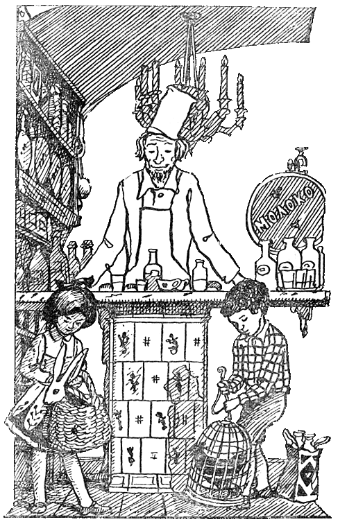 После этого дети поставили на пол корзину и стали разглядывать стены. Повсюду из стен торчали гвозди, а на гвоздях висели сотни всяких мелочей: ржавые ключи, зажигалки, штопоры, очки, расчёски, поводки для собак и пуговицы от пальто.