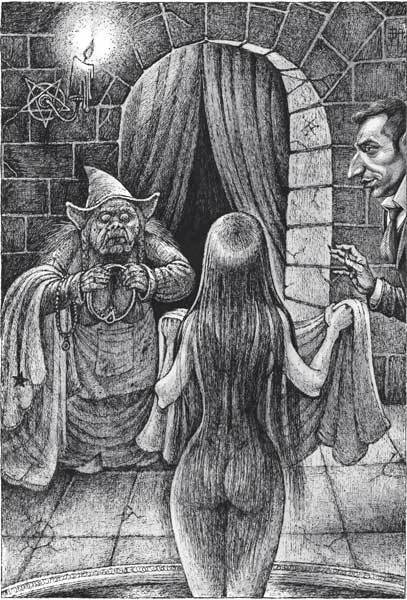 Зала была теперь ярко освещена, на двух треножниках курились уголья и травы, издавая едкий, удушливый запах. На столе горели шандалы с черными свечами, книга заклинаний лежала открытой, а на троне сидело адское существо, уже виденное Мэри, по имени Азрафил. Теперь в середине залы была древняя каменная купель, а около нее помещался треножник с ослепительно ярким огнем. Подле купели стоял совершенно нагой Ван дер Хольм, отвратительный и страшный: его лицо было искажено страданиями, а тело приняло землистый цвет.