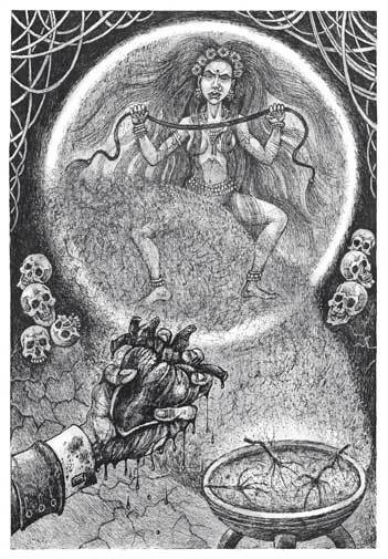 – Смотри, вот чудовище, порожденное кощунством и проклятием. Это мой, а вместе с тем и твой палач, постоянно встающий, чтобы преградить тебе путь к счастью. Этот страх не только отравил твою жизнь, но и погубил душу. Ты принадлежишь аду, откуда вышло это существо без души, порожденное ядовитыми флюидами возмущенной души человеческой. Вражда служит живительным дыханием этому мстителю, а зло, слезы и страдания жертв – его пища. Он и сатана, наш повелитель, завлекли тебя сюда, и теперь наконец ты принадлежишь мне по всем законам ада. Ты будешь моей супругой – такой же лярвой, как и я. Ха-ха-ха! Мы будем жить тут, где я вытерпел свою агонию. Видишь черные пятна на камнях? Это почерневшее кольцо земли будет моим обручальным кольцом. Я надену его на твой палец и по капле выпью твою кровь.