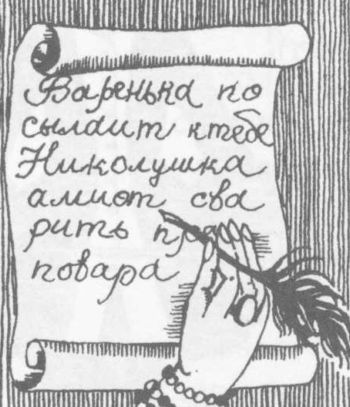 Но даже если образование продолжалось, к русскому языку во многих случаях дети уже не возвращались – занимались французским языком и другими предметами. Результатом было часто встречавшееся, особенно у дам, написание слов „как слышится“ и полное отсутствие знаков препинания. Вот, к примеру, образчики таких писем, авторами которых были весьма родовитые дамы, чье знание родного языка не вышло за рамки начальных уроков грамоты: „Варенка посылаит ктебе Николушка амиот сварить пришлю повара спаваренным которой едит киев там засвидетелствуй писмо мое“ (Е. Н. Давыдова – брату, графу А. Н. Самойлову). „Как ты думаиш где лутчи в Питер или в Москву. И есть резон. Первая расъсеиннее и сестре штонибуть придаставить кудоволствию да и мамзель паискать палутчи вот май виды“ (Е. А. Языкова – сыну, поэту Н. М. Языкову).