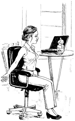 Упражнение 3. Исходное положение: сядьте на стул, закрепите стопы, положите кисти на затылок. Отклоняясь назад, поворачивайте корпус, обращая лицо к полу.