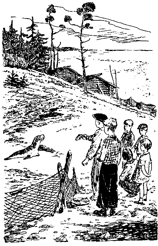 Когда в посёлке стало известно, что рыбаки привезли живого тюленя, на берег сбежались все ребята. Они окружили пойманного зверя, и каждый старался дотронуться до его гладкой, блестящей шкурки.