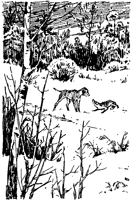 Лиса насторожилась: очевидно, она почуяла человека. Перестала ласкаться к собаке и медленно, как-то нерешительно, направилась по направлению к лесу. Дагон завилял хвостом и побежал рядом с ней.