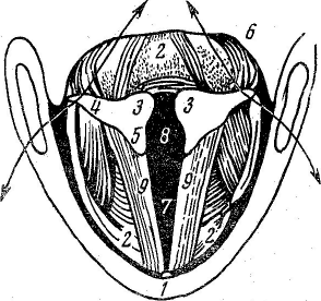 I – щитовидный хрящ; 2 – перстневидный хрящ; 3 – черпаловидные хрящи; 4 – мышечные отростки черпаловидных хрящей; 5 – голосовой отросток черпаловидных хрящей; 6 – перстнечерпаловидная задняя мышца;; 7 и 8 – голосовая щель, 9 – внутренние края голосовых связок. Стрелки указывают направление поворота хрящей 3, от которого меняется просвет голосовой щели.